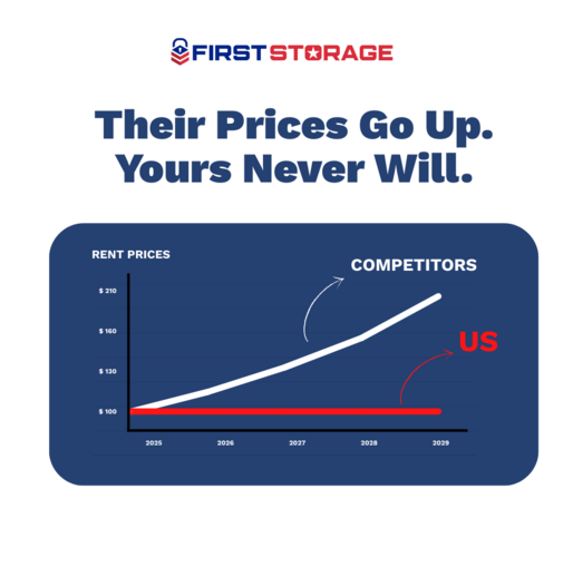 This October, new tenants at First Storage get more than just space—they get peace of mind. When you sign up, the rate you choose on day one is the rate you’ll keep for life. No surprises, no hikes—just a steady promise you can count on.